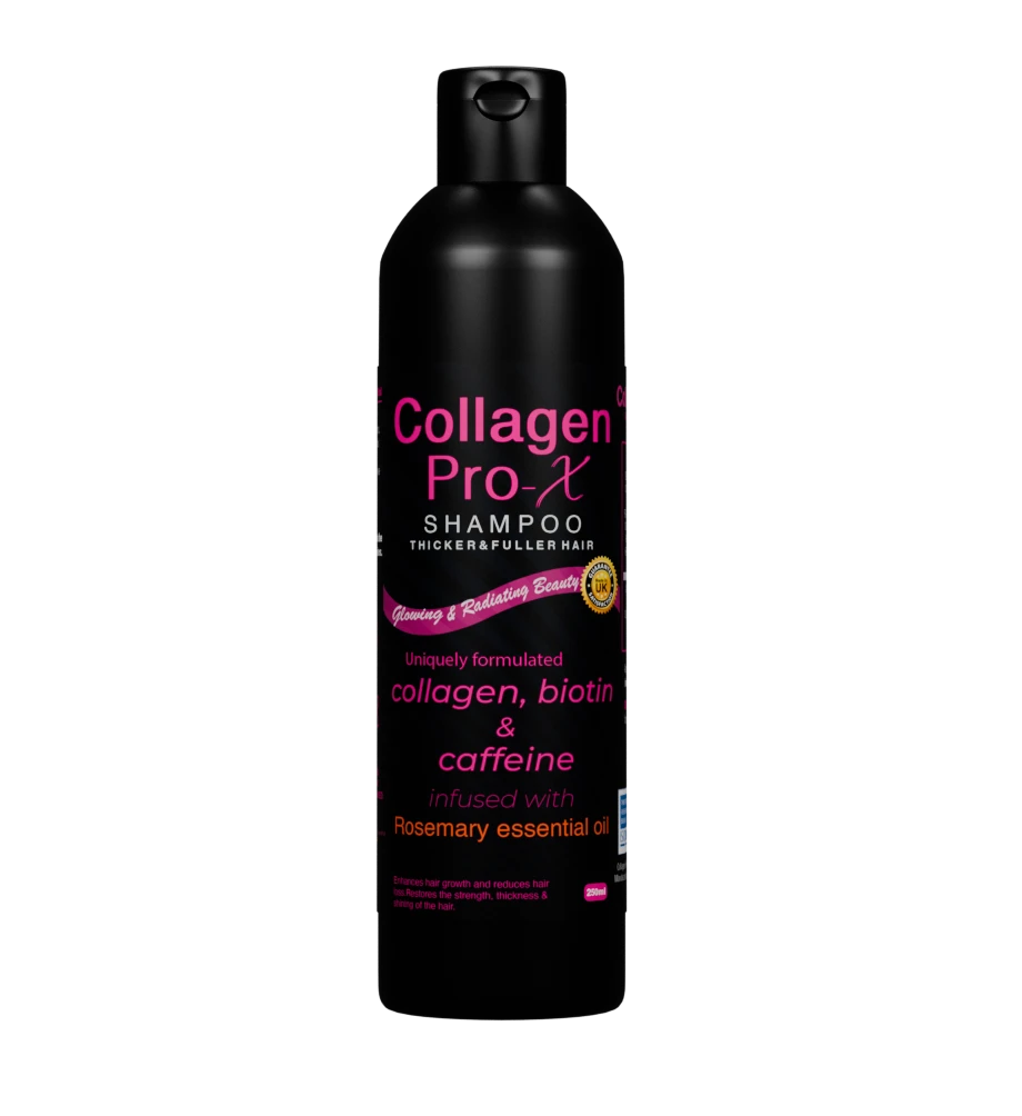 Collagen Pro-x Hair Shampoo, 250ML a Uniquely formulated Collagen, Biotin & Caffeine infused with Rosemary essential oil. Collagen Pro-X has developed a new pharmaceutical grade formulation shampoo, which has a unique combination of natural Marine Collagen, infused with Biotin, Caffeine and Rosemary essential oil to make your hair thicker and fuller. The growth cycle of hair consists of three phases; First the Growth phase; in which hair grows to its full length, Second the Regression phase; in which the hair stops growing, Third the Rest phase; during which hair is forced out by the growth of the new hair. A daily hair wash with Collagen Pro-X shampoo, enhances the blood circulation to the scalp and promotes optimum nutrition of the hair follicles during the phases of hair growth. Thus, the activity of the ingredients in Collagen Pro-X shampoo will stimulate hair growth at the roots and reduce hair loss, making your hair stronger, thicker and fuller.
